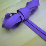 - Válasszunk színben a háromszögekhez illő szalagot. (A legegyszerűbb ferdepántot venni – ez a neve, hogy ferdepánt –, ebből van pamut is, meg elegánsabb selyem is, – mi most 2 cm széleset választottuk).