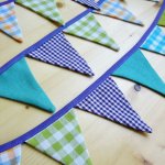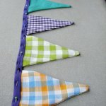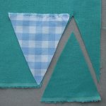- Válogassunk össze színben összeillő anyagokat és döntsük el, hogy milyen hosszú díszt szeretnénk és mekkora háromszögekből. (A mi háromszögeink alapja 8,5 cm, magassága 10 cm.)