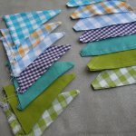 Ha nem orbitális méretű háromszögekkel csináljuk a díszünket, akkor ez remek alkalom lehet a korábban megmaradt kisebb anyagdarabok felhasználására. Sőt, a sokat emlegetett újrahasznosítás témáját most is meg kell, hogy említsem, hiszen a képeken látott anyagok közül korábban több is ágyneműhuzatként szolgált, és majdnem egy régi kedvenc, de elszakadt, kockás pizsama nadrágomat is felhasználtam, de végül mégsem, mert volt benne piros szín. Majd legközelebb… ; )